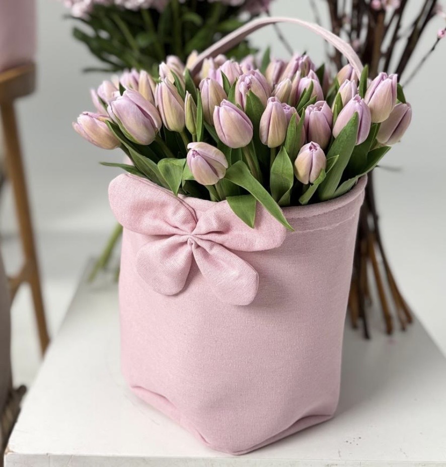 Buket lala u roze korpi. Boja lala moze se razlikovati sa fotografije