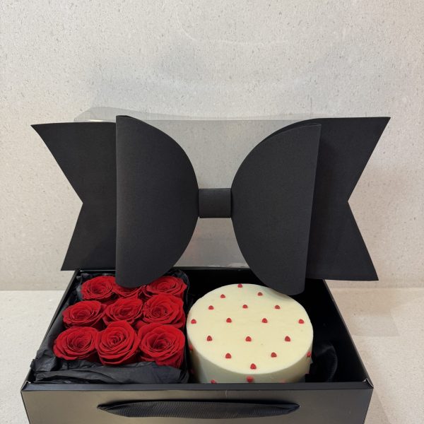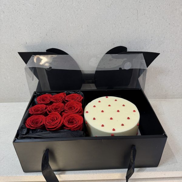 Roze poklon kutija sa dehidriranim ružama i slatkišima